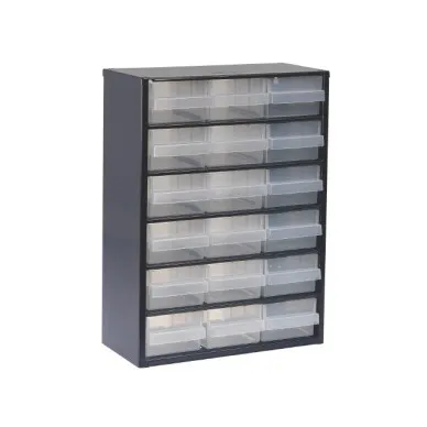 "Raaco" Sarja 150 teollisuus. Korkeus 417 mm. Tukeva, hitsattu teräsrunkorakenne, kumitassut. Kirkkaat, jaettavat muovilaatikot, jossa vedin ja etiketinpidin. Hyllytasojen ohjauslistojen ansiosta laatikot liukuvat kevyesti omalla paikallaan. Laatikoiden pysäytin estää niitä putoamasta. Laatikostoja voidaan pinota päällekkäin tai asentaa seinälle, sijoittaa seisomaan työpöydälle, kiinnittää alustalle tai pyörivään lattiatelineeseen. Ruostesuojattu kasto- ja pintamaalauksella, väri antrasiitinharmaa.