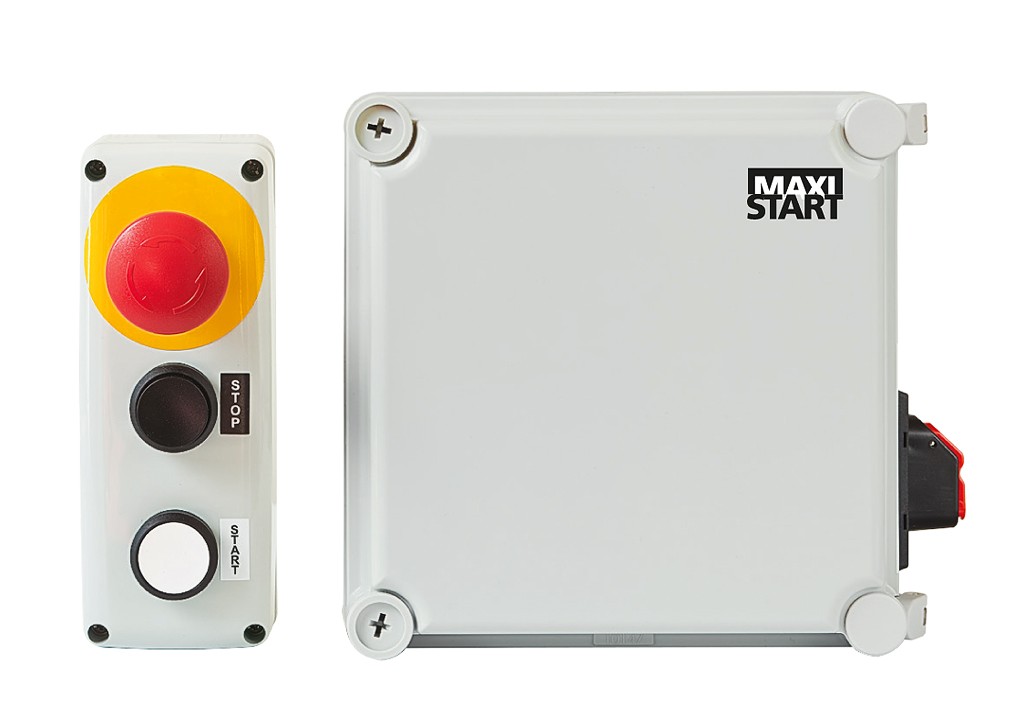Toimitukseen sisältyy erillinen painikekotelo jossa on lukkiutuva hätä-seispainike keltaisella taustalla, valkoinen käynnistyspainike sekä korotettu musta pysäytyspainike.